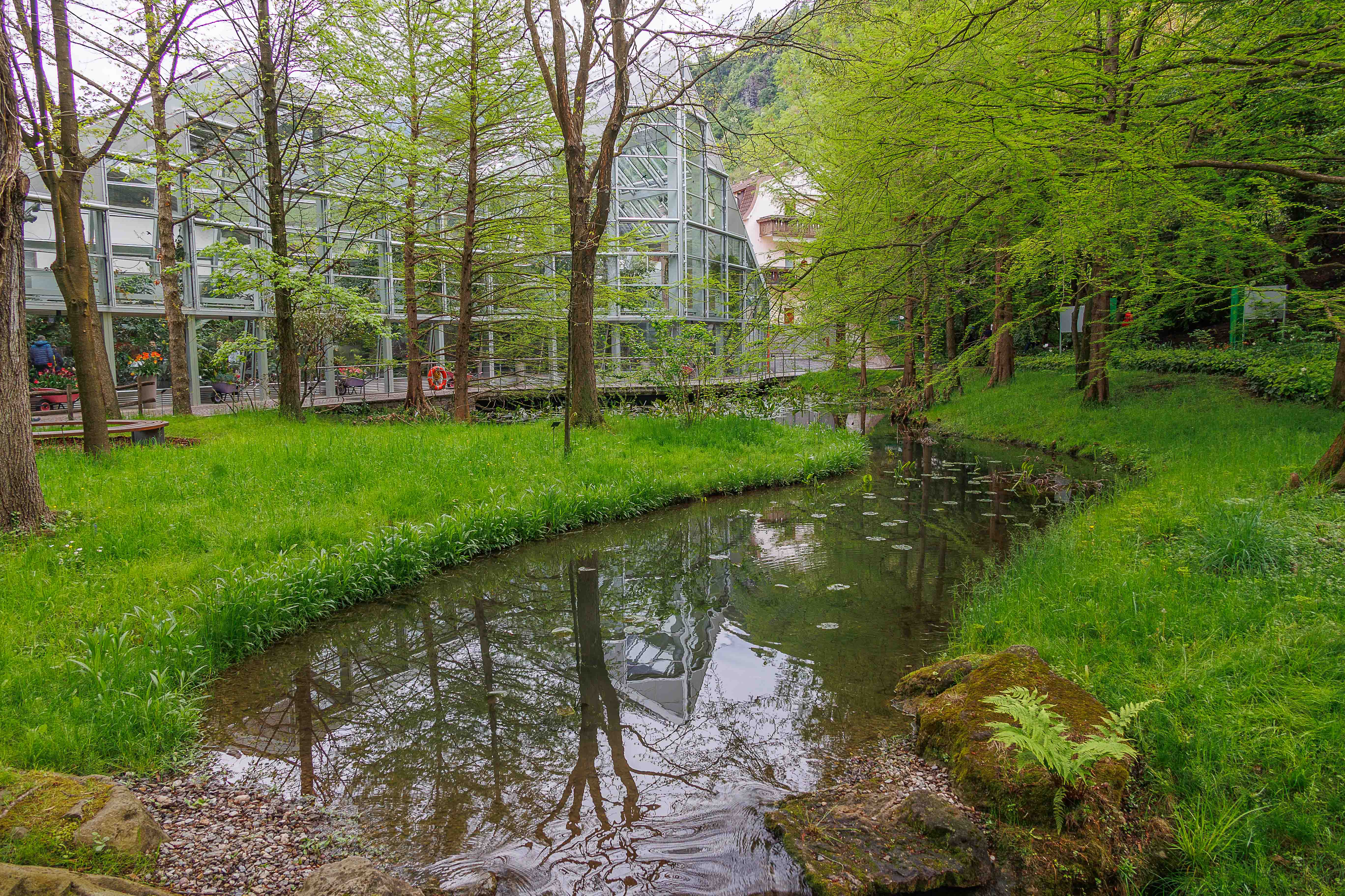 - Waldgärten: Hier gedeihen Laub- und Nadelhölzer aus Nord- und Südamerika sowie Ostasien. Das Farntal mit seinen Bachläufen und Wasserfällen bietet erfrischende Kühle .
